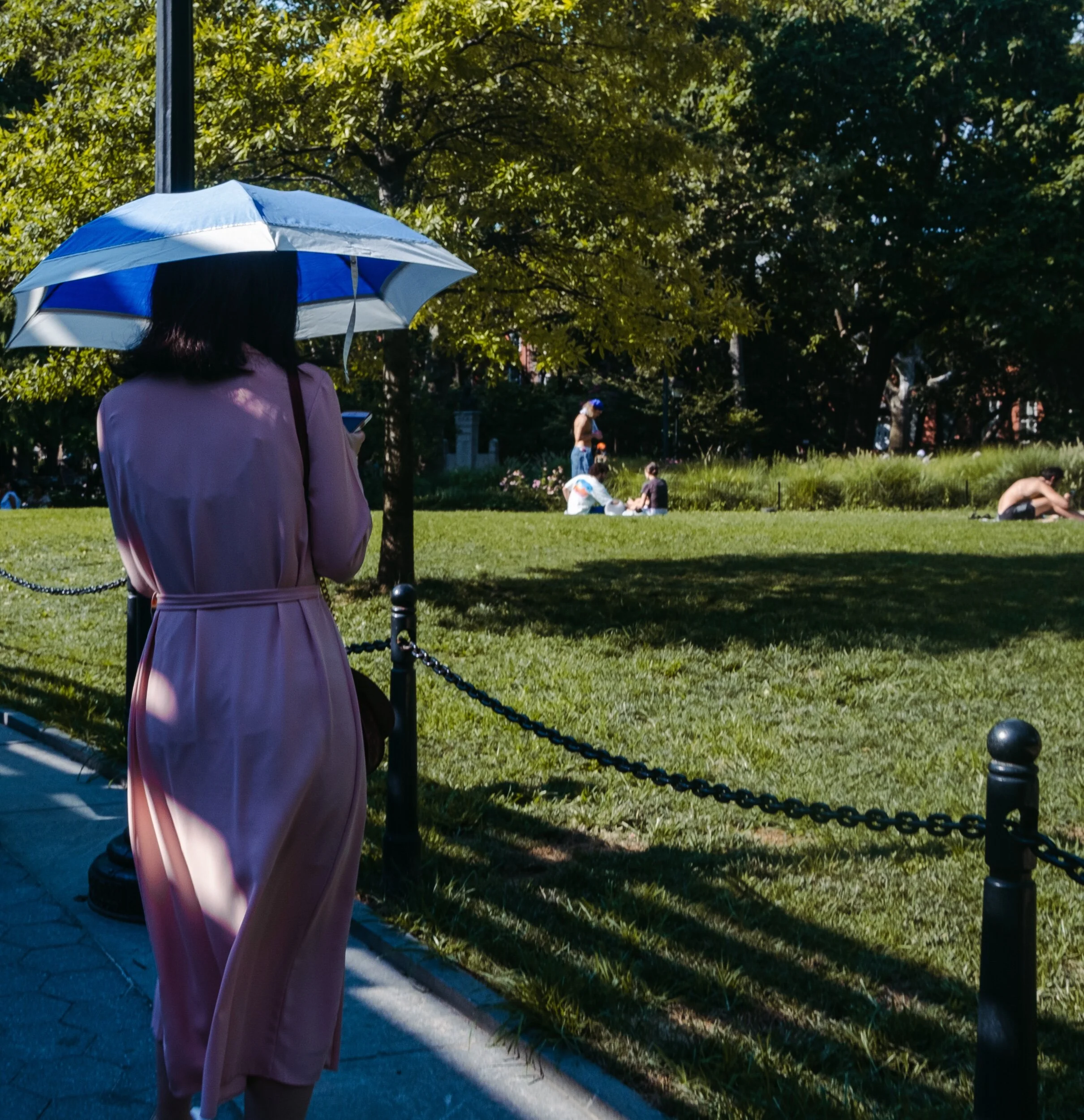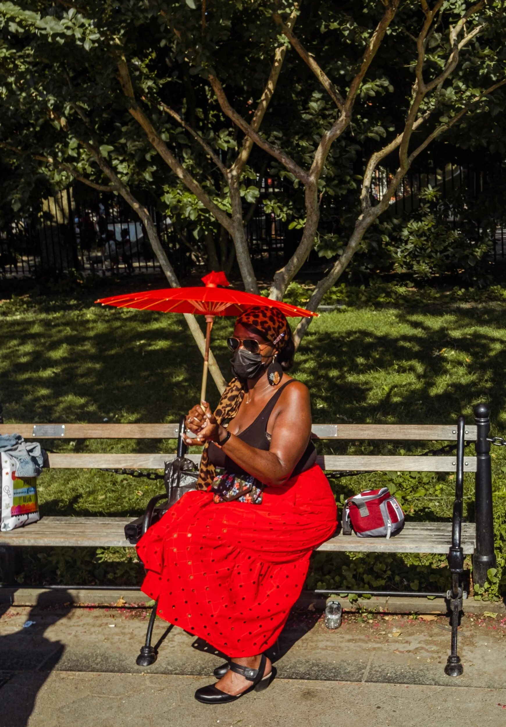 There’s a feeling of longing coming from our subject to the left. If I was bold enough to create a story I’d say she was lonely or waiting for someone and watching others enjoy themselves reminds her of friends or a loved one. The shadows and cuts of light that travel throughout her figure help with that feeling. Also while red is a bold color that carries the feeling of strength in the previous two photos the blue in her umbrella brings weakness.
